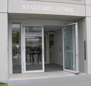 Der Eingang fügt sich so perfekt in die Fassade ein, dass er von weitem kaum erkennbar ist. Der Schriftzug „Stadtbibliothek“ ebenso wie das internationale „Willkommen“ (mehrsprachig) sind erst kurz vor dem Betreten lesbar.