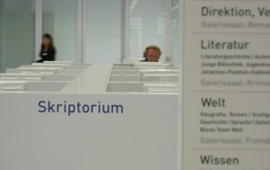 Einzelne Räume sind mit Verben beschriftet, welche die Tätigkeit in diesen Räumen verdeutlichen: „Zuordnen“ und „Einordnen“ für den Servicebereich, „Begegnen“ für Kommunikationszonen. Dem entgegen steht leider das hochtrabende, an die mittelalterliche Bildungselite erinnernde „Skriptorium“, welches hier aus einem PC-Pool besteht. Auch diese kulturell-historische Verbindung mag wohl kaum für alle BürgerInnen naheliegend sein.
