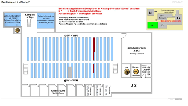 Der Leitfaden thematisiert das Browsen – nicht am Regal, aber zumindest im Katalog – parallel zur gerichteten Recherche. Dem Browsen ist sogar ein eigener Abschnitt im Leitfaden gewidmet! Nur: Hat man ein Buch im Katalog gefunden, das einen interessiert, ist die große Frage: Wie komme ich vom Katalog zum Buch? Der Leitfaden fragt: „Werden alle notwendigen Informationen angeboten, wo ein Objekt in der Bibliothek zu finden ist? – Bibliothek, (Standort), Raum/ Fachbereich, Regal und Signatur sind in herkömmlichen Bibliotheken notwendig, um ein Objekt zu lokalisieren.“[3]